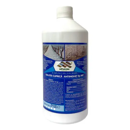 Solutia cuprica antiinghet tip Mif este un produs agrochimic cu caracter de fertilizant, utilizat in scopul intretinerii plantatiilor de pomicultura, viticultura si legumicultura, in perioadele cu variatii importante de temperatura (socuri termice).